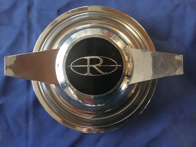 Refinished 1964 Buick Riviera Turbine Wheel Covers, featuring a distinctive cast aluminum design with turbine-style fins, a central "R" emblem, and a spinner. Fully Refinished, solid, polished aluminum.
